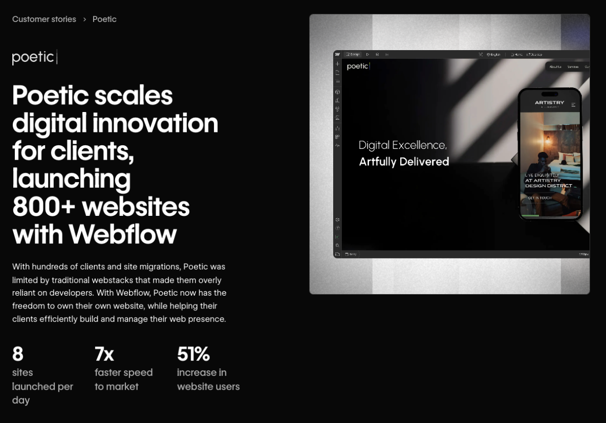 Collaborating with Webflow’s Senior Content Marketing Marketing, I craft customer stories that illustrate the power of Webflow for companies of all industries. We’ve started by focusing on longer-form stories and have branched out to include shorter-form content.